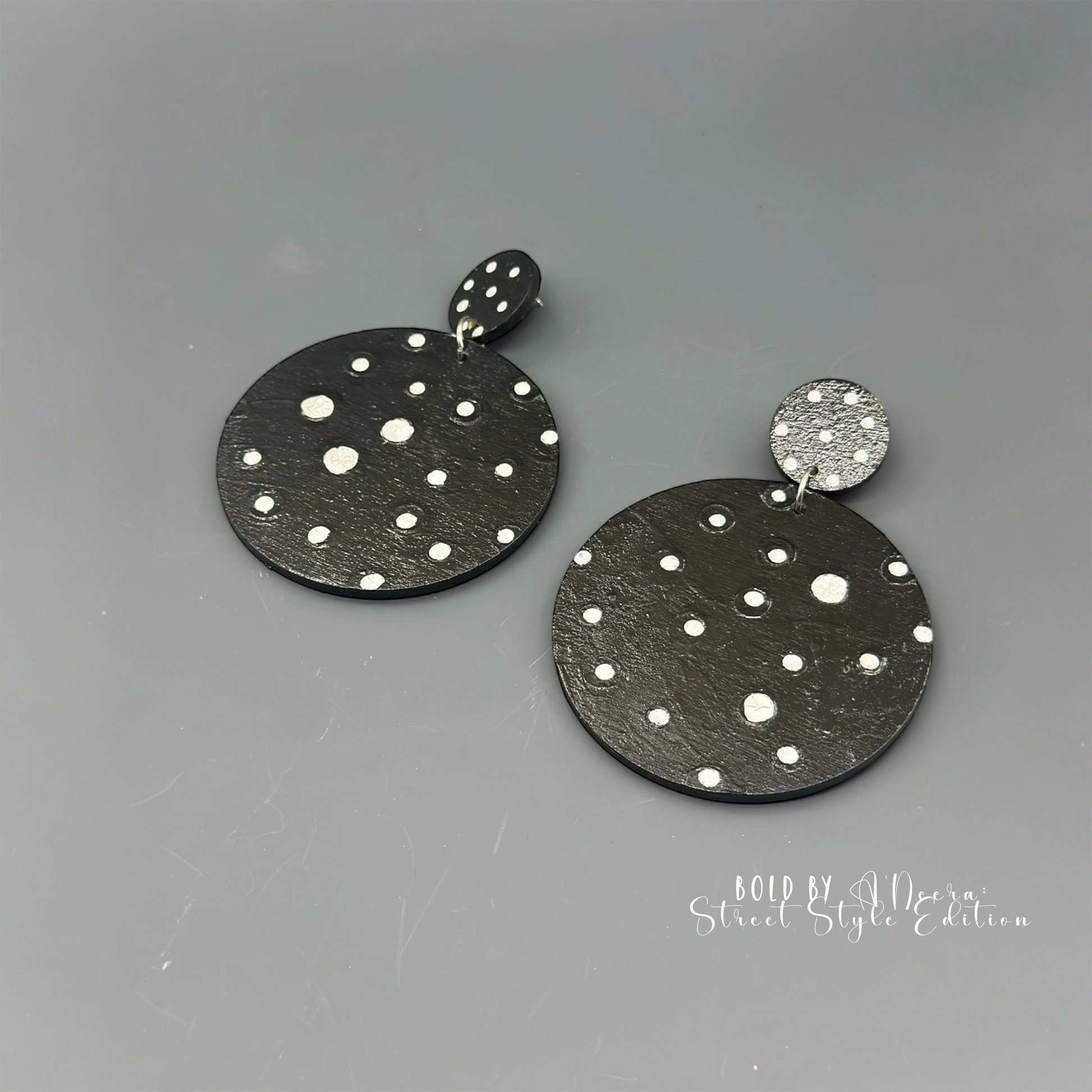 Playful yet edgy, these hand-painted wood earrings bring a bold twist to a timeless pattern. Featuring a sleek black base accented with metallic silver polka dots, each pair is finished with a clear protective coating for subtle shine and lasting durability. Lightweight and full of personality, they’re the perfect mix of fun and fierce street style.