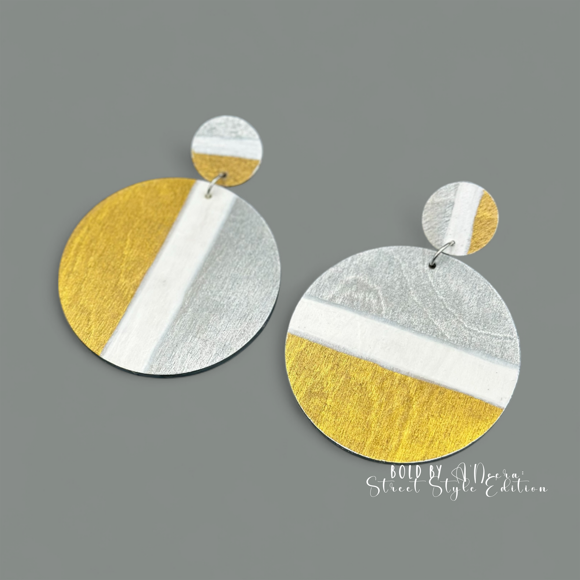 Bold yet refined, these hand-painted wood earrings showcase a modern fusion of metallic gold, soft silver, and crisp white. The clean geometric lines create a sleek, architectural look, while the matte finish keeps the design grounded and effortlessly wearable. Lightweight and striking, they’re the perfect balance of statement-making and minimalist edge.